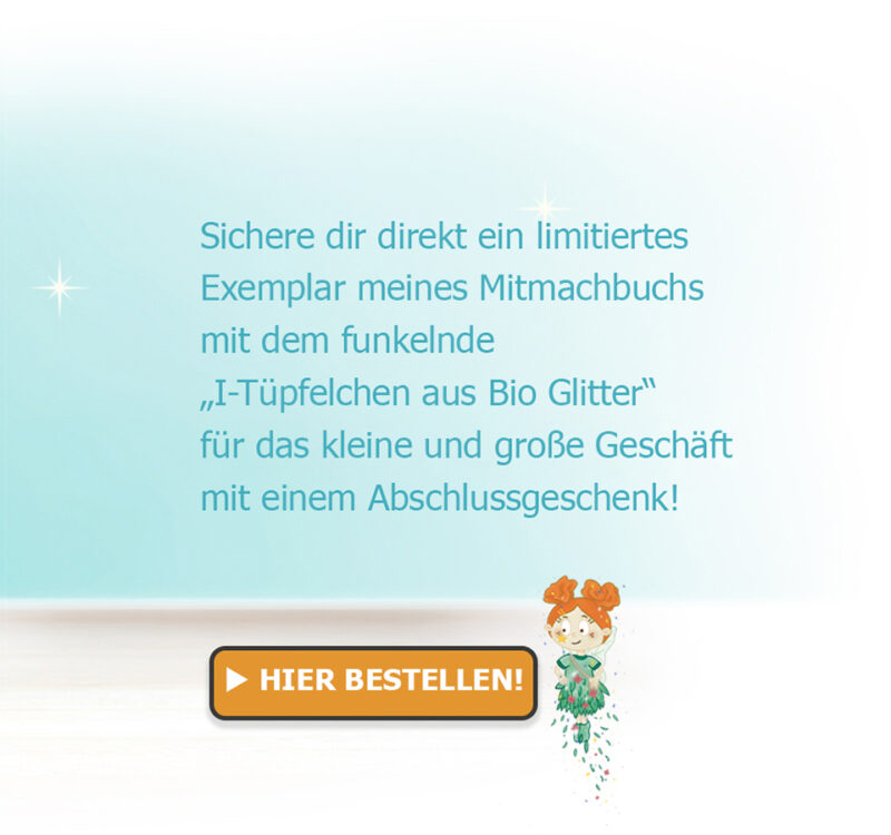 1. Wenn du merkst, dass dein Kind an meiner Geschichte interessiert ist, frag es am Ende, ob es auch eine Pippifee haben möchte. Erkläre, dass ihr gemeinsam auch funkelndes Pipi zaubern könnt. Möchte es dein Kind, ist es super, dann nix wie los und es darf die Klappe auf der vorletzten Seite im Buch vom Töpfchen öffnen und das Deco Bioglitter in eurem Beisein schonmal bestaunen.